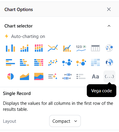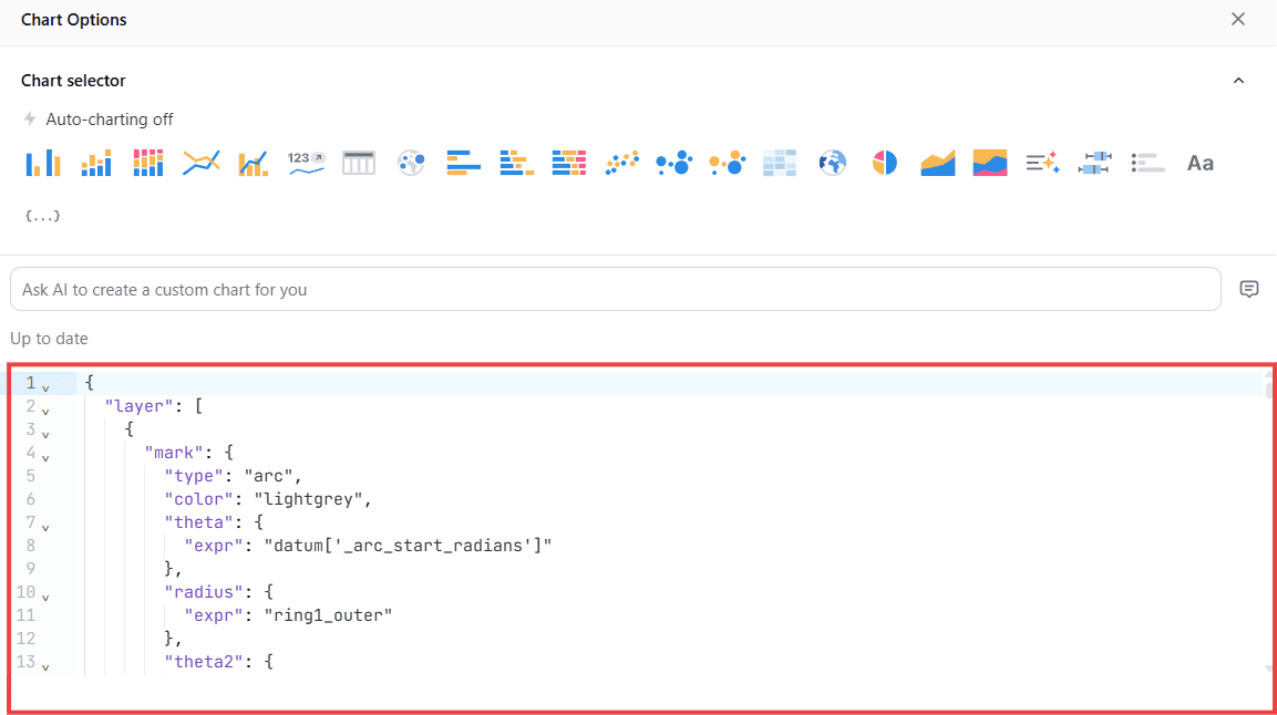There are 2 options to create the chart: either give the AI a prompt and it will generate Vega-Lite code for the visual, or write your own Vega-Lite code.