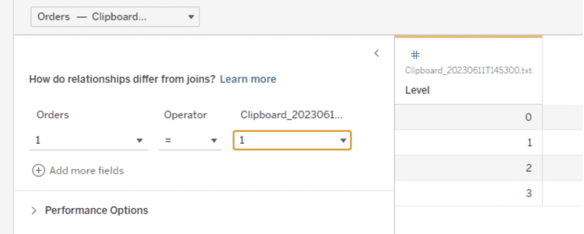 To do the data densification, add a table in relation to a relationship calculation of 1 = 1, as shown below. This will give you 4 rows (with Levels as 0, 1, 2, and 3) for every row in the Orders table.