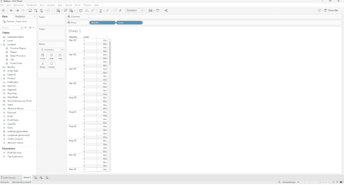 To test if the “internal densification” works properly, drag Months and Level to Rows.