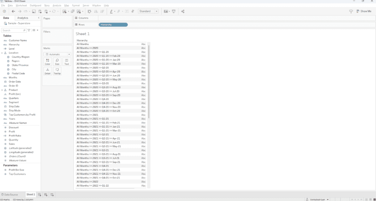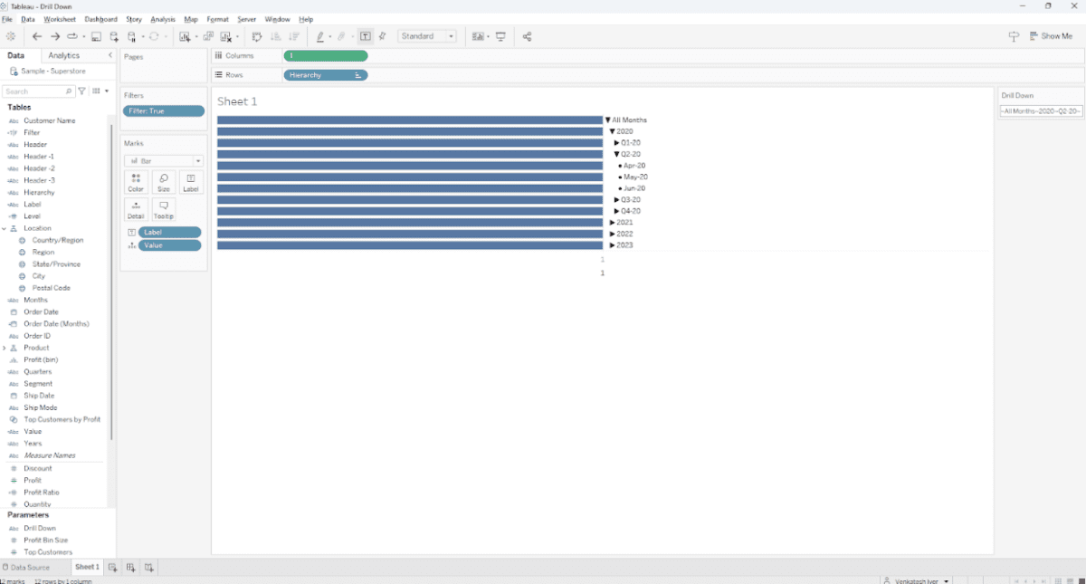Please note that to get the drill down table to look like that, a few calculations from Tableau Visionary Rosario Gauna’s amazing blog on a related topic will be used here.