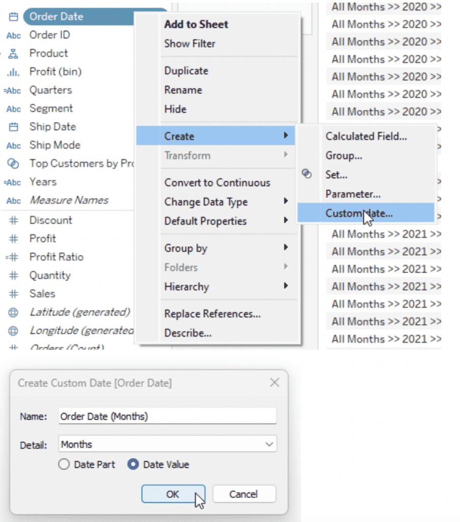 Notice that since this is sorted alphabetically, the Months in the Quarters are not in the right order. To fix this, create a Custom Date with the Order Date field and use it to sort the Hierarchy, as explained in the following images.