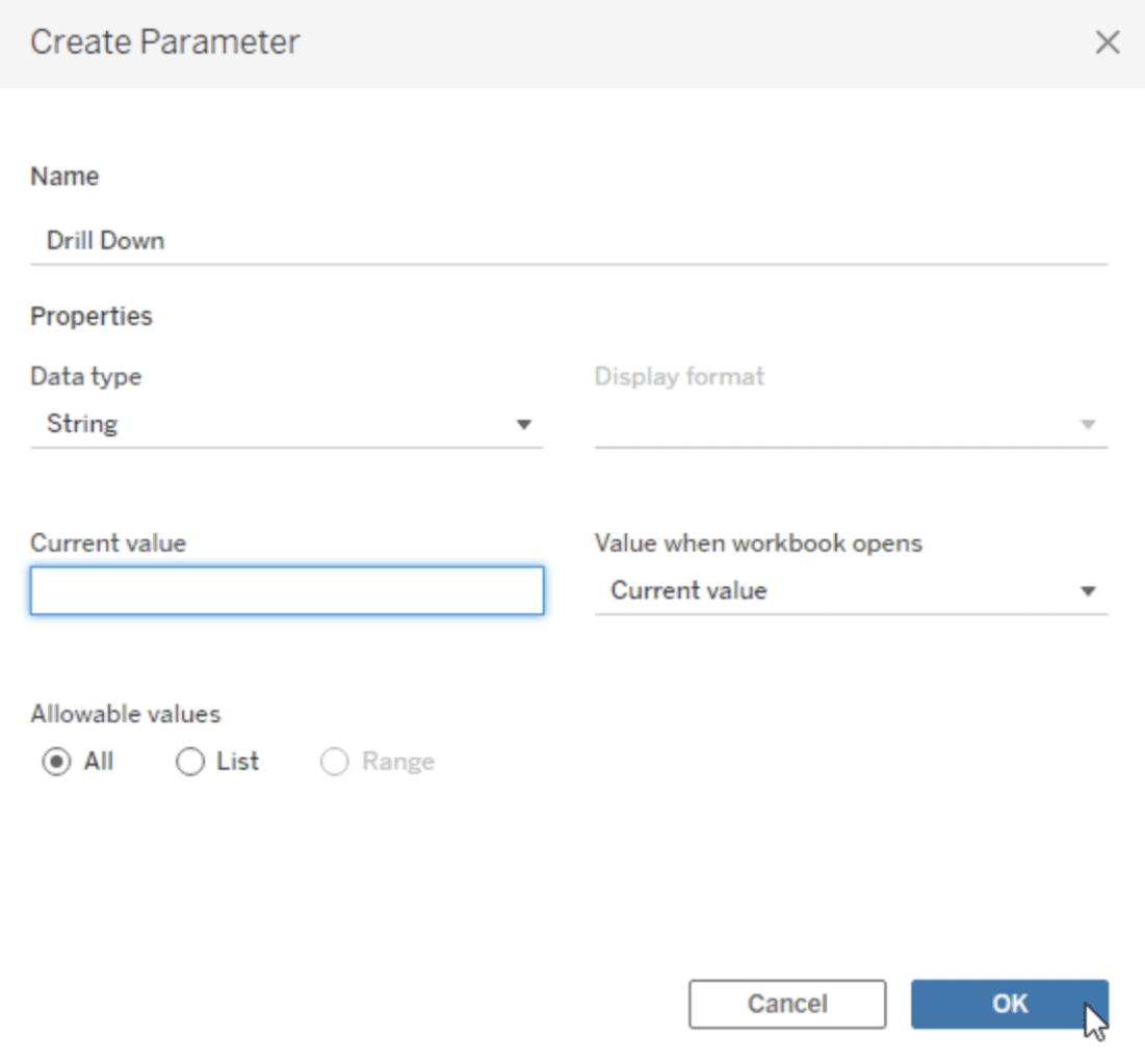 In order to expand and collapse the drill down table when the user clicks on it, you will have to use a multi-select parameter action. For that, create a parameter as per the following image.
