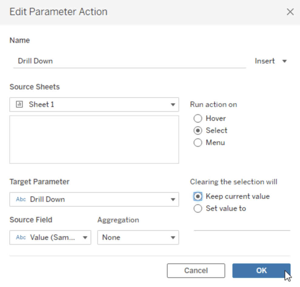 Next, Add Value in Detail and create a parameter action on the worksheet as per the following image.