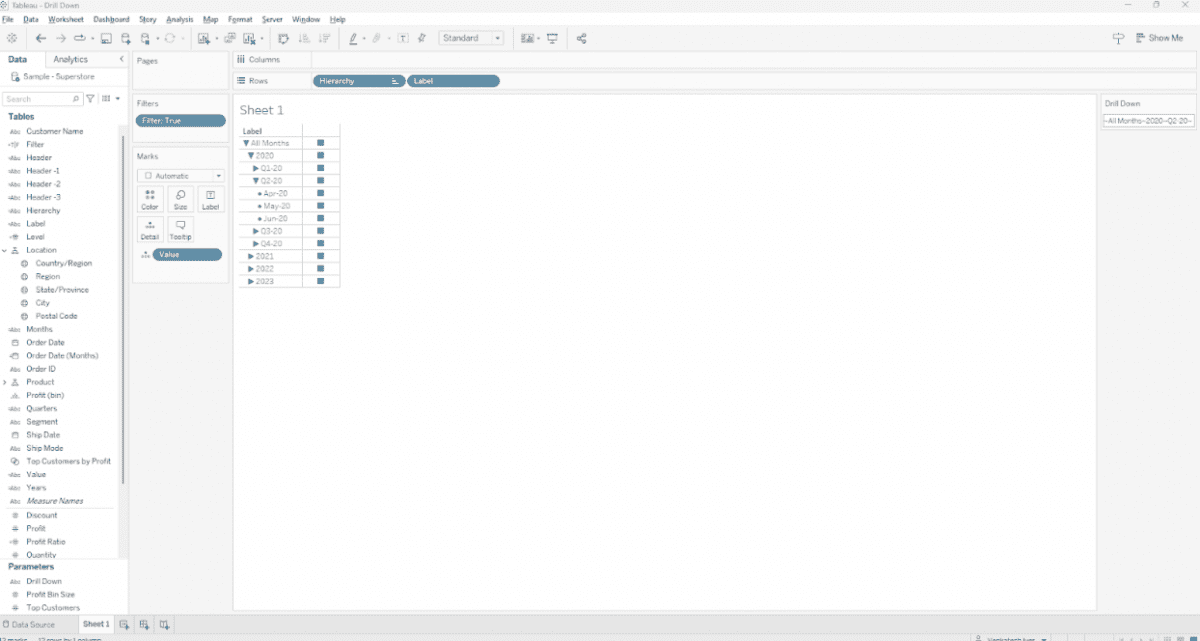 Have you ever wanted to just create a drill down table in Tableau, but all the solutions you found either added additional columns for each subsequent level you drill down to OR removed the subtotal/parent level when you drilled down, OR took a huge toll on performance when you incorporated it? If yes, then you have come to the right page.