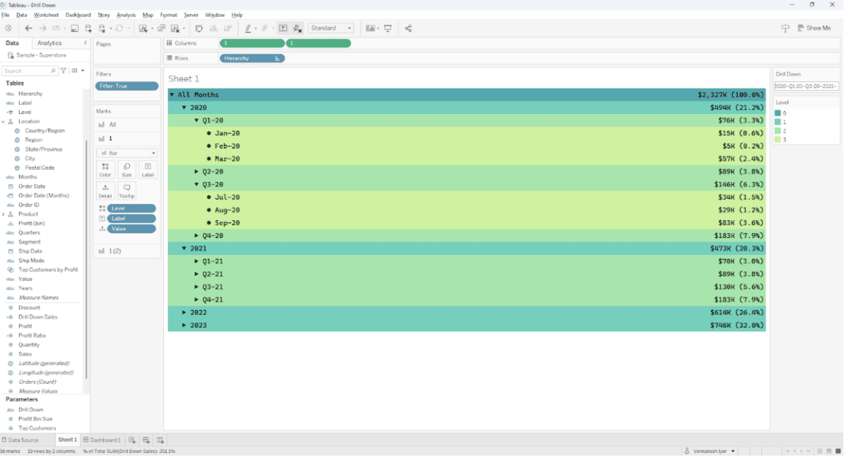 Ctrl+Drag the 1 field next to the 1 field in Columns and replace the Label with Sum(Drill Down Sales) in the new 1(2) card. You can customize the label and sheet to your liking until your drill down table looks like the one in the following image.