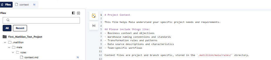 Project and business rules (such as preferred components, connection patterns, or business logic) can be “set and forgotten” with context files. You don’t have to reiterate requirements in every prompt because Maia reads all.mdfiles in.matillion/maia/rules/on each interaction.