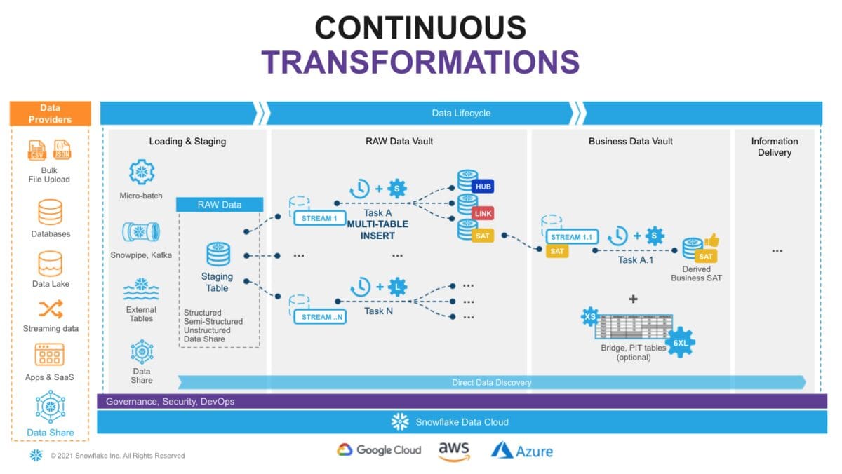 Tasks with multi-cluster virtual warehouses will have sufficient computing power to handle workloads of any size, and load balances all the tasks as you introduce more hubs, links, and satellites to your data vault. In addition to tasks, Snowflake has serverless tasks, a fantastic capability that allows you to rely on compute resources managed by Snowflake.