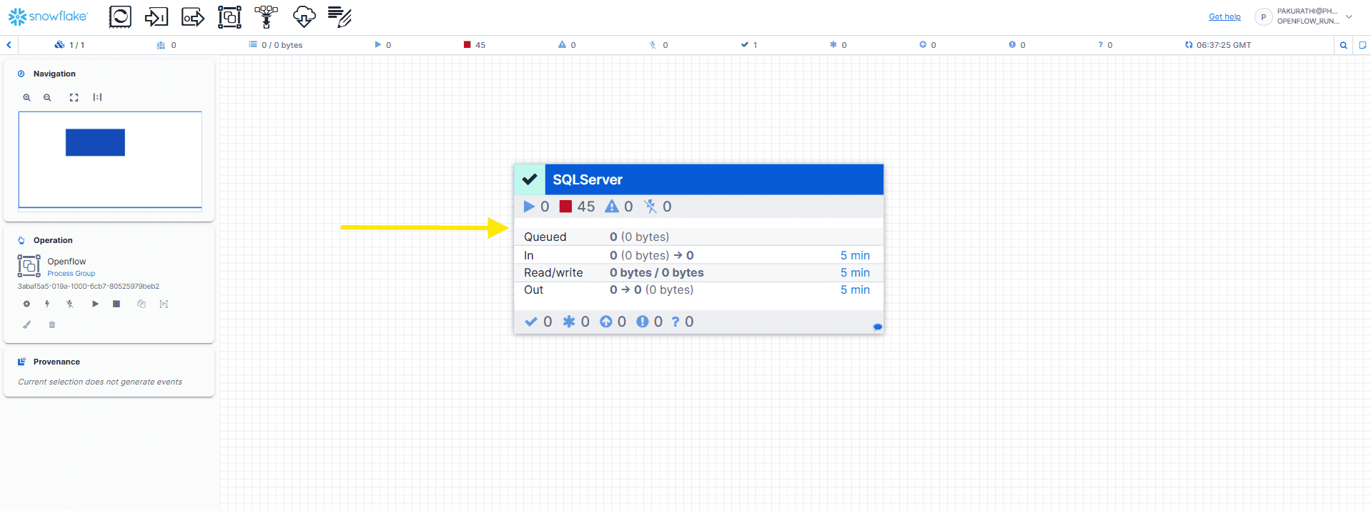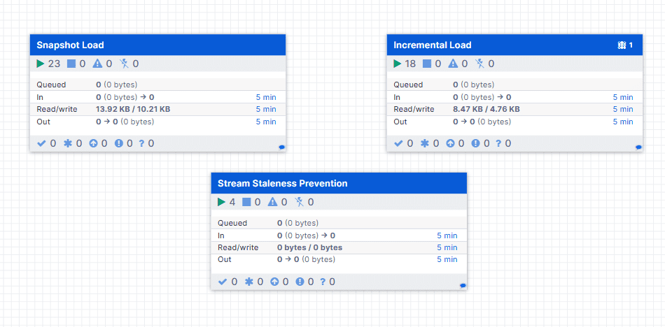 Double-click the Connector Process Group to view its internal components. You will notice three sub–process groups, each indicated with a green play icon to confirm that their processors are running. By drilling into these groups, you can observe every stage of the pipeline, from data extraction to transformation to loading, providing full visibility into how records move from the source system to Snowflake.