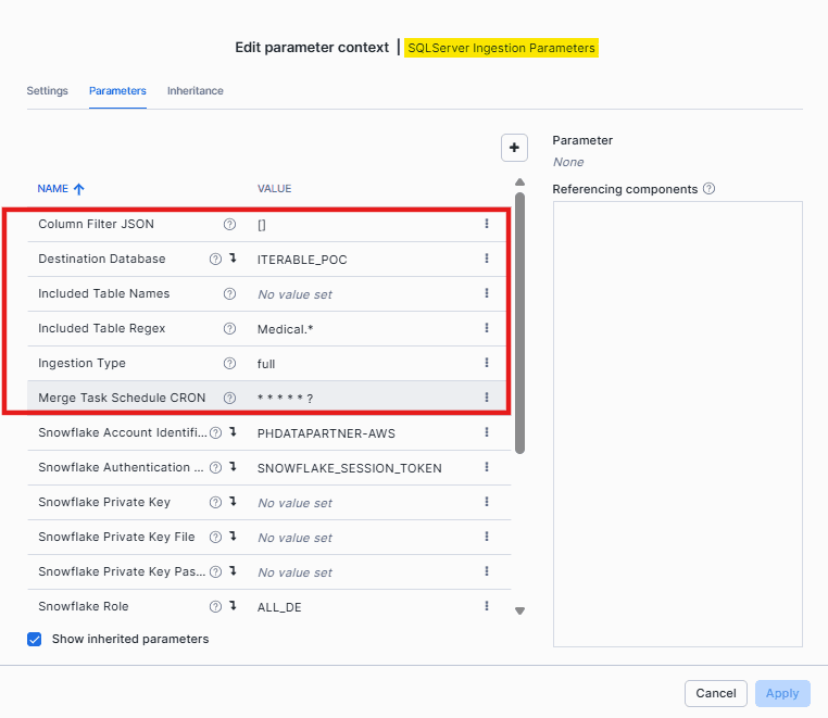 Once you have filled in all the required parameters, click Apply. The connector now has everything it needs to talk to both the source and the target. However, it still won’t start pulling data until you specify which tables to replicate. After you add that, the connector knows it needs to sync the Medical table.