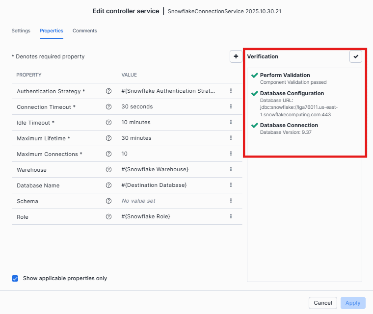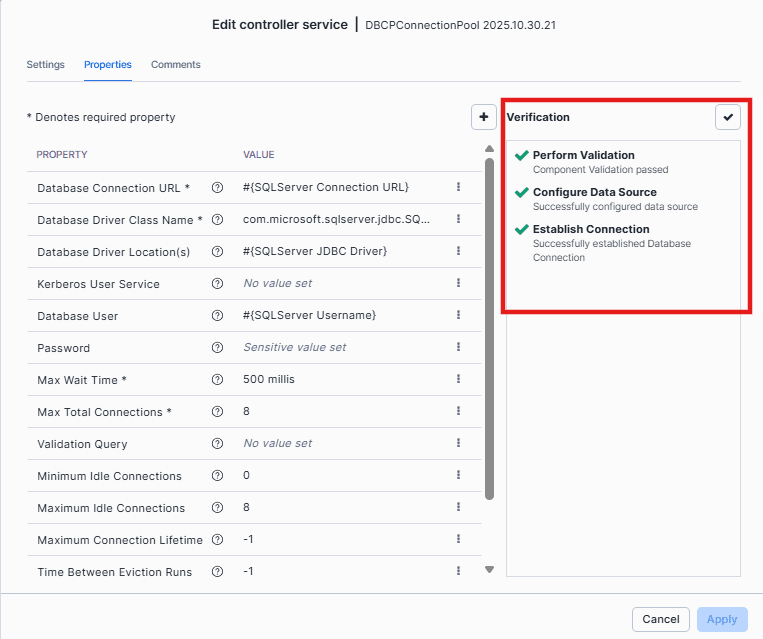 On the Properties tab, you’ll see a Verification checkmark; use it to validate that the connection is working. (Need to disable this service before verification.)
