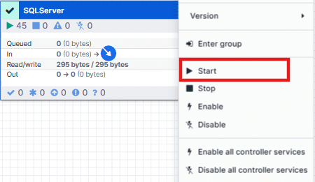 Next, start the SQL Server connector itself. Right-click the SQL Server Connector Process Group and choose Start. This action activates the full pipeline, allowing the connector to establish communication with both SQL Server and Snowflake and begin its replication workflow.