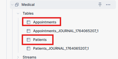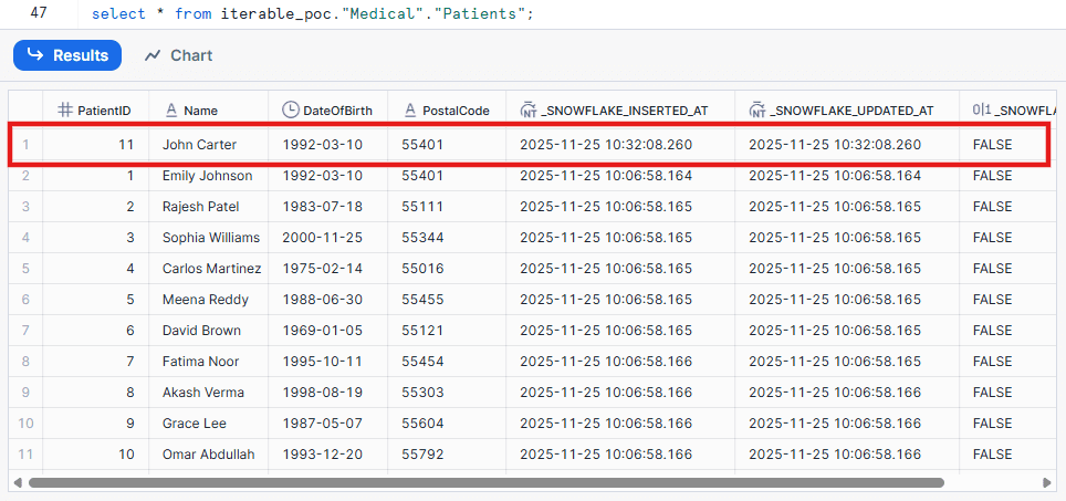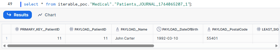 Verify in Snowflake: Query the target Medical tables in Snowflake. Within a minute (based on your CRON schedule), the inserted record will appear in the patient’s journal table inside the Medical schema.