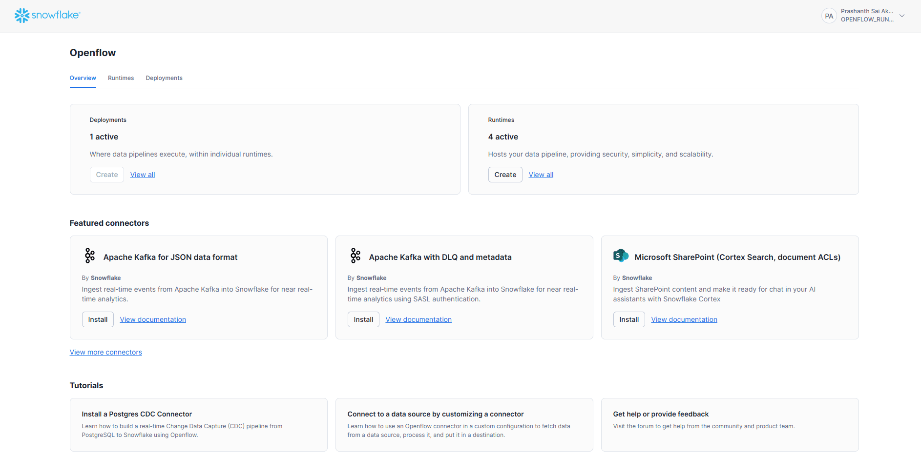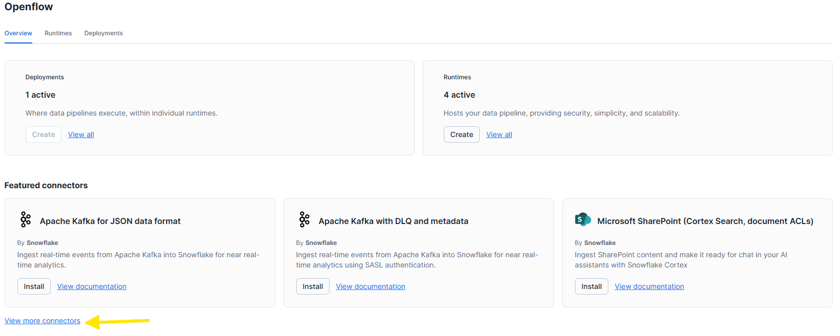 From the Openflow overview page, click View more connectors to open the full catalog.
