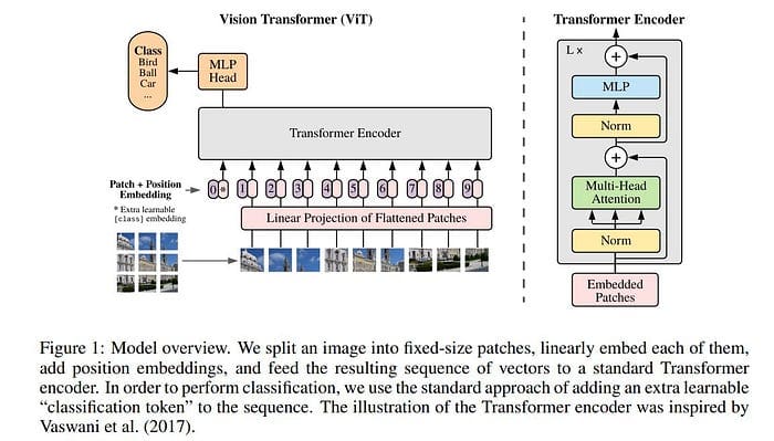 As shown in the figure below, transformer-based vision models work by first creating patches akin to tokens in NLP tasks. Then, a linear projection on the flattened patches is introduced, and positional embeddings are added. The result is fed to the Transformer architecture block, and a multi-layer perceptron (MLP) head is used for classification.